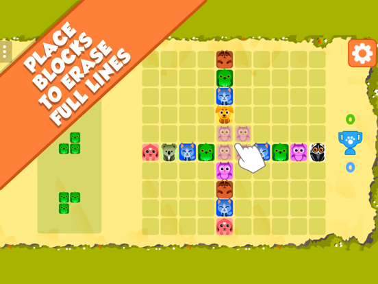 1010 Animals is an addictive puzzle game which is easy to learn but hard to master! Your goal is to score as many points as possible. Drop cute animal blocks on the game field and try to create full vertical or horizontal lines. As soon as a line is full, it is removed from the field. If there's no space left to add a block, the game is over. You can’t rotate the blocks, so be sure to place them strategically across the board. You can only use the blocks that are given to you on the left side on the screen. If there isn’t any room left on the playing field for one of these blocks, the game is over. You can’t exchange or discard one of them. If you can’t use them all you will have to start over again. And that’s the strategic part of the game. The more you play the more you will get a feeling how to place certain shapes in order to use them in the most efficient way. The more lines you can make disappear the more points you get. And that’s the ultimate goal: get the high score! This wonderful block puzzle game is not about fancy power-ups. It leaves you alone with your strategic thinking skills and of course that little bit of luck that sometimes is required to reach the highest score. Features: - Addicting gameplay - Classic highscore game - for kids and adults - play offline anytime - free block puzzle
