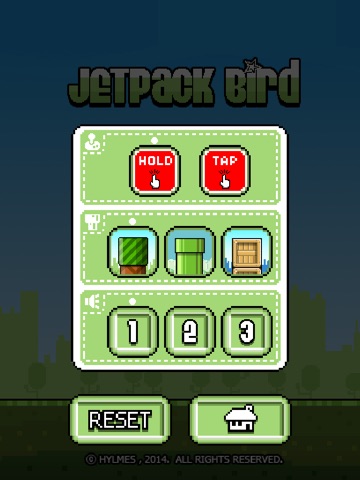 Jetpack Bird dreams of flying with his tiny wings. Finally he can fly with jetpack. HOLD or TAP on your device to make him fly. Avoid obstacles to beat your friends high score. FEATURES: • Simple but skillful "One Touch control... just HOLD or TAP" arcade game • 2 Control Types - HOLD and TAP • 3 World Skin Types - FOREST, PIPE and BOX • 7 Trophies for your scores - BRONZE, RUBY, SILVER, CRYSTAL, GOLD, MASTER and PLATINUM • Universal App - Buy once, play on iPad and iPhone • Integrated Game Center Leaderboards • Optimized for iPhone 5 Notice: This game is inspired by "Flappy Bird", a really genius game by "GEARS Studio" (but not available anymore in the world) and a remake of "Flappy Bird" and dedicated to Flappy Bird Lovers.